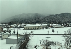 帰りの日本は大雪で新幹線の窓からは雪景色、35℃の世界から
